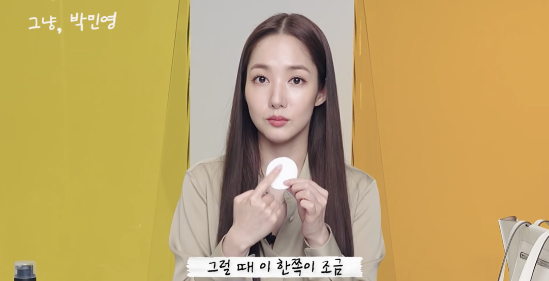 与化妆棉搭配的是朴敏英分装的卸妆水,她表示当自己的妆容出现结块的问题,就会用化妆棉蘸取卸妆水把结块擦掉,上一点保湿精华之后再补妆。