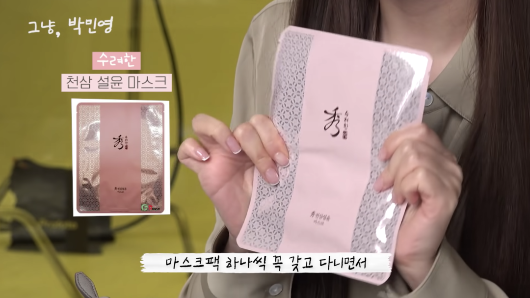 作为秀雅韩的代言人,朴敏英是一定要为这个品牌打call的,她上妆前所用的面膜就是来自秀雅韩家,这个牌子也是LG集团的,虽然在国内不是特别火,但是他家从配方到面膜纸剪裁都很良心,即使是美白面膜也具备了消炎的功效,很适合干皮女生。