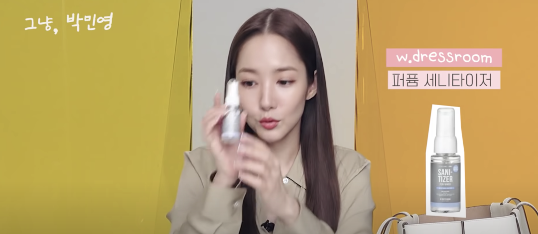 朴敏英备了两款消毒产品,Vant 36.5主要是凝胶质地,而w.dressroom则是喷雾,w.dressroom使用的范围更加广泛,除了喷在手上,也可以喷在手机上,马桶圈等地方,更适合外出使用。
